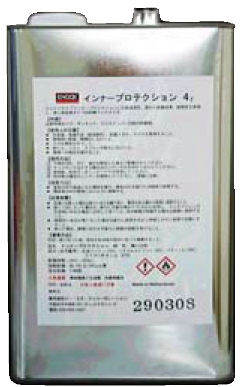 薄白色半透明のワックス系防錆剤です。420mlスプレー缶と4Lの2サイズがあります。最大の特徴は浸透性の高さ。金属表面に深く染み込み、内部から防錆膜を形成します。耐熱温度は160℃。表面が乾燥しないタイプなので、時間が経っても柔軟性を保ち、鉄板の膨張・収縮に追従します。